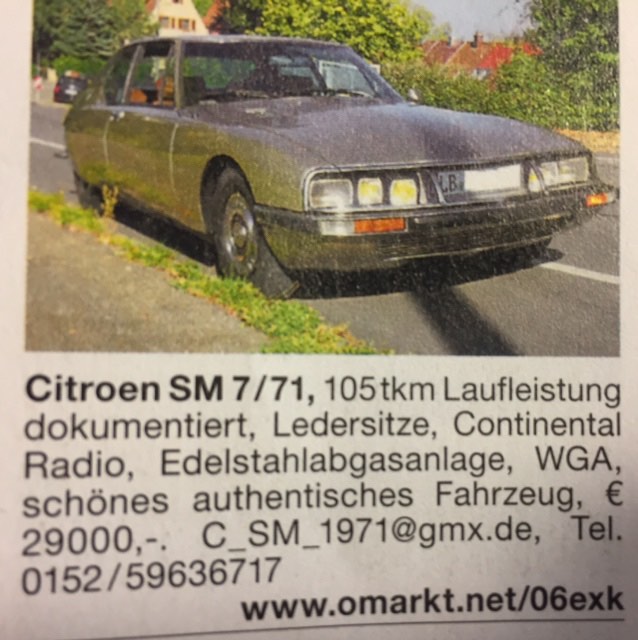 hier ist noch ein SM in einer Gazette namens "Classic Cars 09/2017" annonciert gewesen: