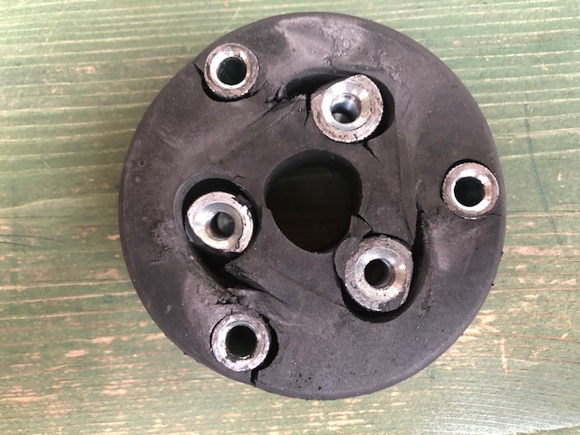 Es war die nagelneue vordere Hardyscheibe der Zwischenwelle, siehe Foto, keine 1500 km alt. Sehr bekannter renommierter Lieferant. Mein genialer Beifahrer/Mechaniker hat das Ding mit längsgeschlitzten Benzinleitungsteilen notrepariert, sodass wir noch 120km ins Tagesziel fahren konnten - max 2500 U/min war recht langweilig. Dort hat seine Frau schon mit dem passenden Ersatzteil gewartet. Wir glauben, dass der unverstärkte Gummi die Schläge beim Einschalten des Klimakompressors nicht aushält, es war ein extrem heißer Tag.