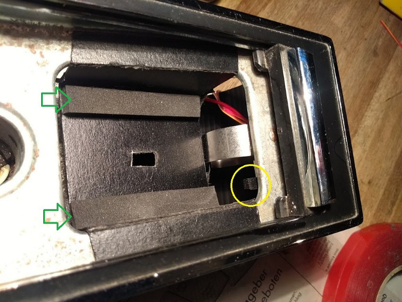 So sitzt der Schalter (gelb), außerdem die zuvor erwähnten Abstandsleisten damit das Modul sauber aufliegt (grüne Pfeile):