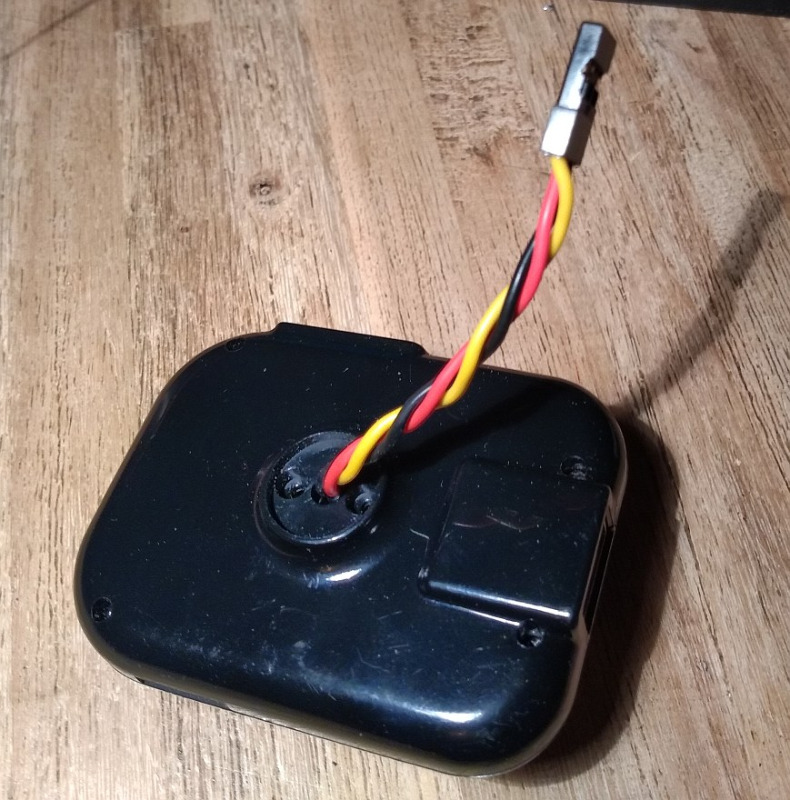Nun kann man gleich eine dreiadrige Leitung von hinten durchfädeln und anlöten. Ich habe da was vorgefertigtes mit Stecker genommen (Servoverlängerungskabel), dazu später mehr: