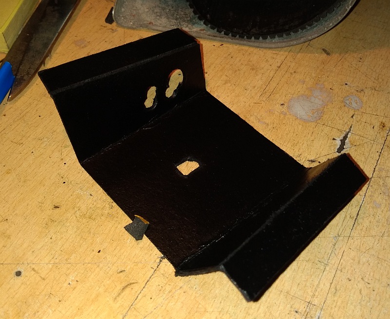 Für die Halterung wollte ich eigentlich erst einen Blechwinkel machen, meine Pappschablonenlösung hat sich aber auch schon als hinreichend stabil erwiesen.