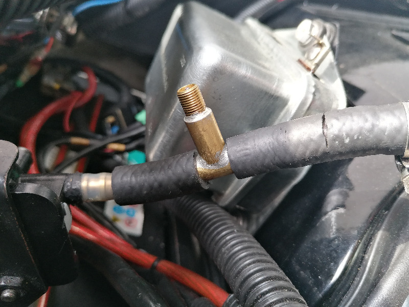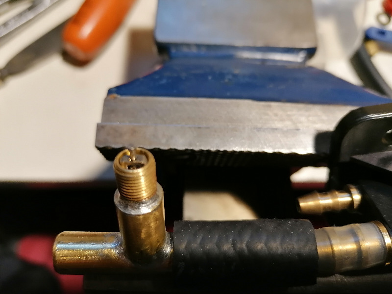 2. den Ventilträger mit dem darin befindlichen Ventil vom Gimmi lösen und dann das ganze Teil in ein T-Stück aus Messing einlöten. Das T-Stück habe ich mir