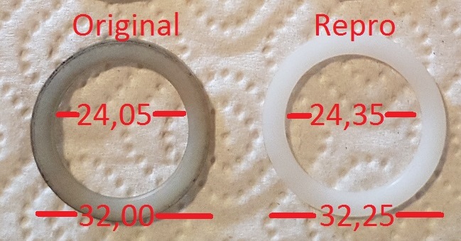 Auch ist der Innendurchmesser der Repro-Scheiben etwas zu groß geraten, so daß sie im eingebauten Zustand Spiel erzeugen.