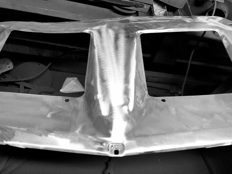 Mein Vorgänger hat die Frontschürze mit 2mm dicken Schichten von Primer, Kitt, Schrumpellack etc überdeckt. Ich schleife gerade alles runter,