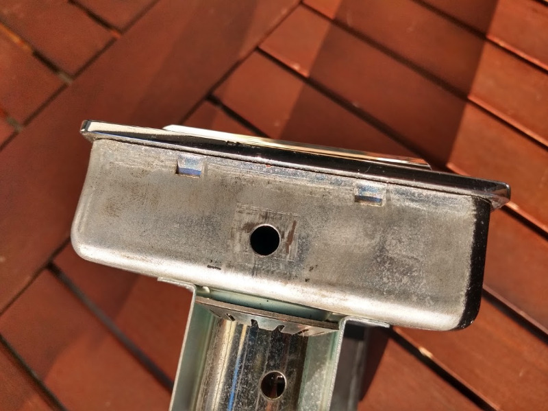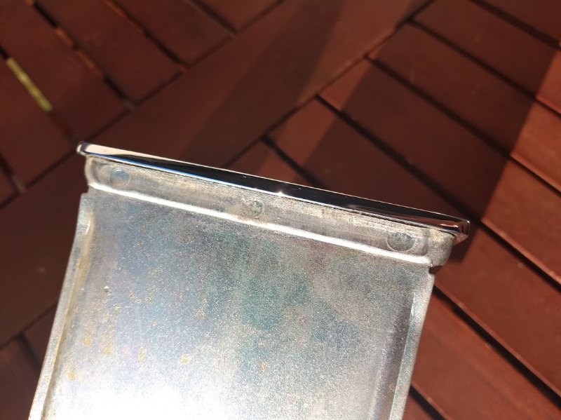 Die seitlichen Blechzungen haben gar keinen Kontakt mit der Blende, entlang der Längsseiten läßt sich die Blende auch ein bißchen hochdrücken. Nur an den Stirnseiten scheint sie fest zu sein, an der einen Stirnseite ist so eine Art Verprägung zu sehen.