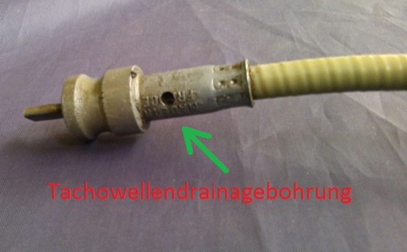 6) Die okinoole Tachowelle hat seitlich eine kleine Entlüftungsbohrung, denn sonst drückt es das Getriebeöl bis in den Tacho. Ist das Loch bei der Der Franzose´n Welle auch drin?