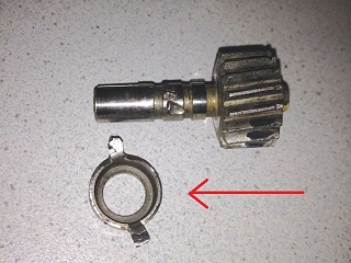 Die Metallscheibe am unteren Ende der Buchse nimmt die Achsialkraft des Ritzels auf, so wie drunter der Nocken im Getriebeloch.