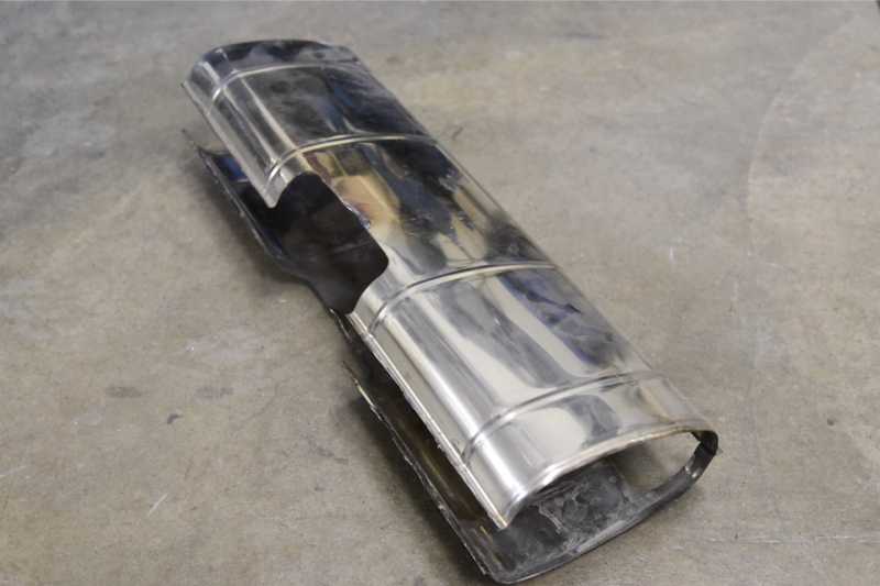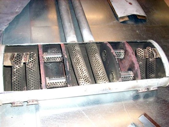 Neu angefertigte gebogene Lochrohre in den Außenkammern und die aufgeschnitten Lochrohre mit Bohrungen in der Mittelkammer.