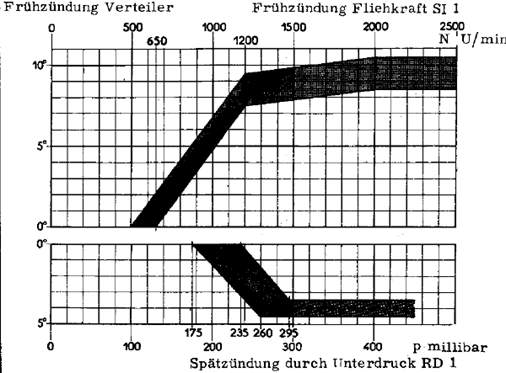 Zum Verständnis: Diese Kurven beziehen sich immer auf den Verteiler an sich, also U/min am Verteiler und die Grad Frühzündung ebenfalls am Verteiler. Da der Verteiler halb so schnell dreht wie der Motor sind diese Werte für Motorumdrehungen/-Grad zu verdoppeln.