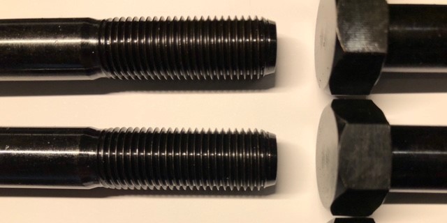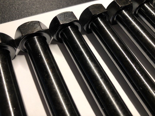 Die Schrauben habe ich aus 1.7225+QT (42CrMo4+QT) in Deutschland fertigen lassen; sie haben die Festigkeitsklasse 10.9. Das Gewinde ist wie im Original gerollt und nicht geschnitten.